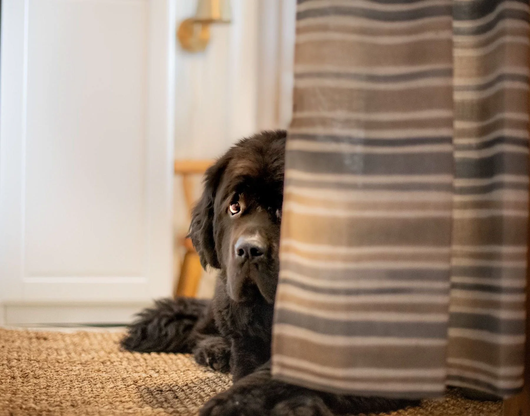 To make the most of our budget, we carried that same Cloud White right up onto the paneled ceiling. Suddenly, what had once felt dated looked fresh and cottage-y. The old accordion doors were beyond saving, so we swapped them for something simple but full of character: a curtain rod made from copper plumbing pipe, with a doubled-up fabric shower curtain hung in place of a door. It was an easy project, inexpensive, and added just the right touch of charm. Russell (our Newf) enjoys the little bit of privacy it provides and loves to lay behind them. With $4,000 to work with, creativity was our best tool, and little details like this made the room feel personal rather than store-bought.