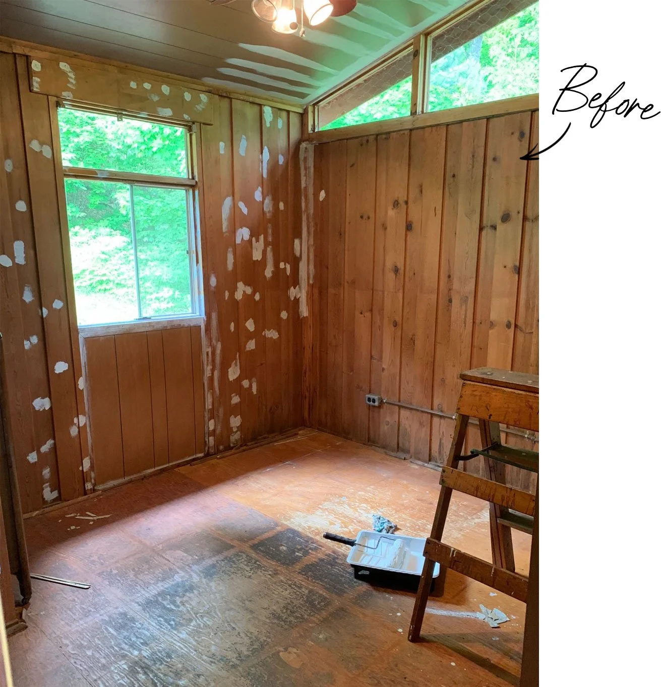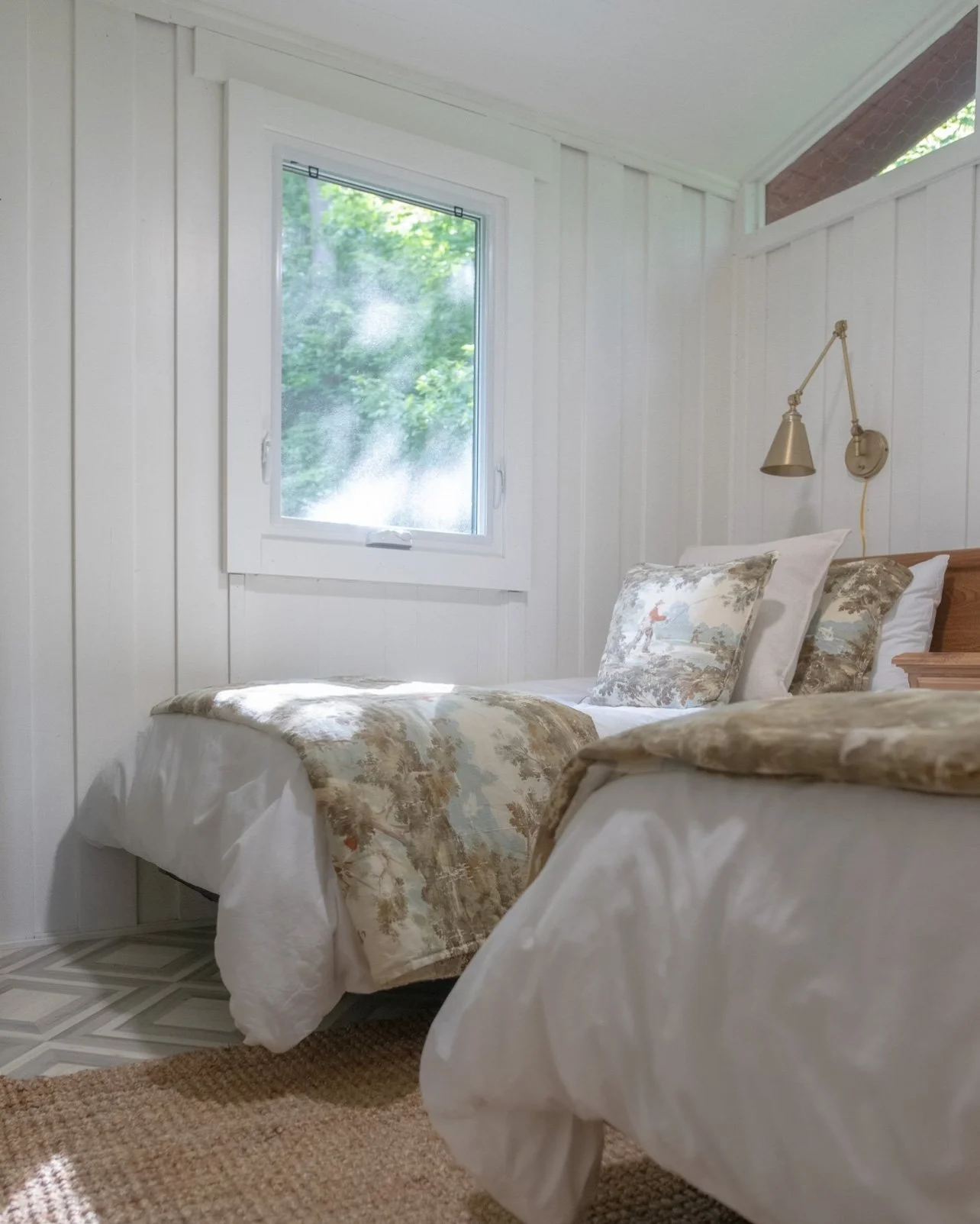 The twin bedroom was the very first space we tackled in our lakeside cabin renovation. Looking back, I wish we had snapped a few “before” photos, because the room did not seem nearly as rough until we stripped it down to the bare bones. The cabin itself is only 750 square feet, with two bedrooms, a bathroom, and an open-concept kitchen and living area. There is also a screened porch, not included in that square footage, that makes the whole place feel just a little bigger and brings in the lake breezes we love.