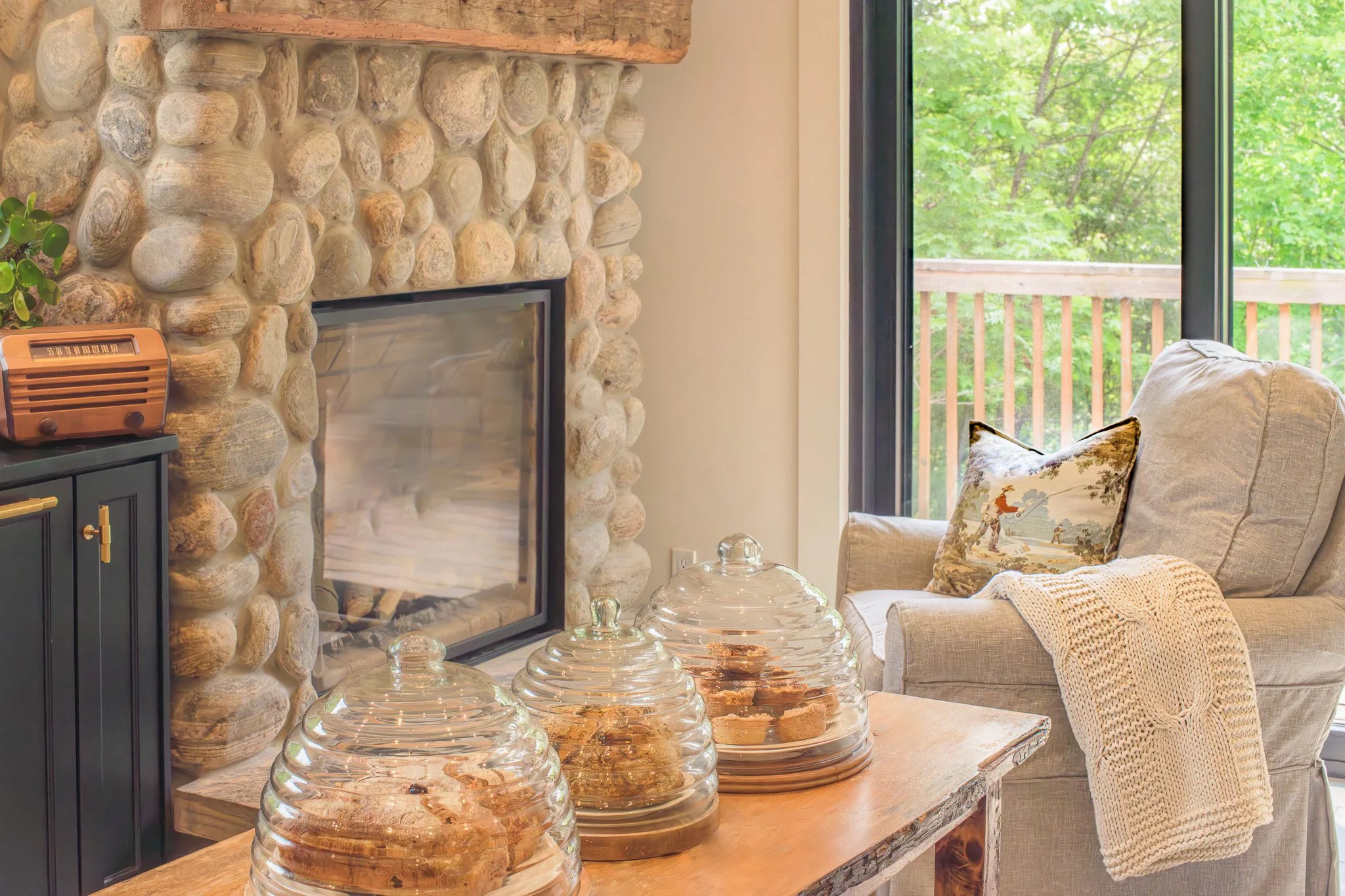 On a shoestring budget, we came up with a quick survival plan. We painted the cupboards, added a butcher block countertop, and tucked a bar-height table under the window (thank you, Wood Creations of Muskoka). That patchwork kitchen carried us through the next 25 years. Along the way, we did add a gas fireplace (courtesy of The Fire Within), wrapped it in river rock with a barn beam mantel, and popped a couch in front. That cozy little corner instantly became my husband’s favourite spot in the house. From that moment on, I knew: when the time finally came to renovate the kitchen for real, the fireplace was here to stay.