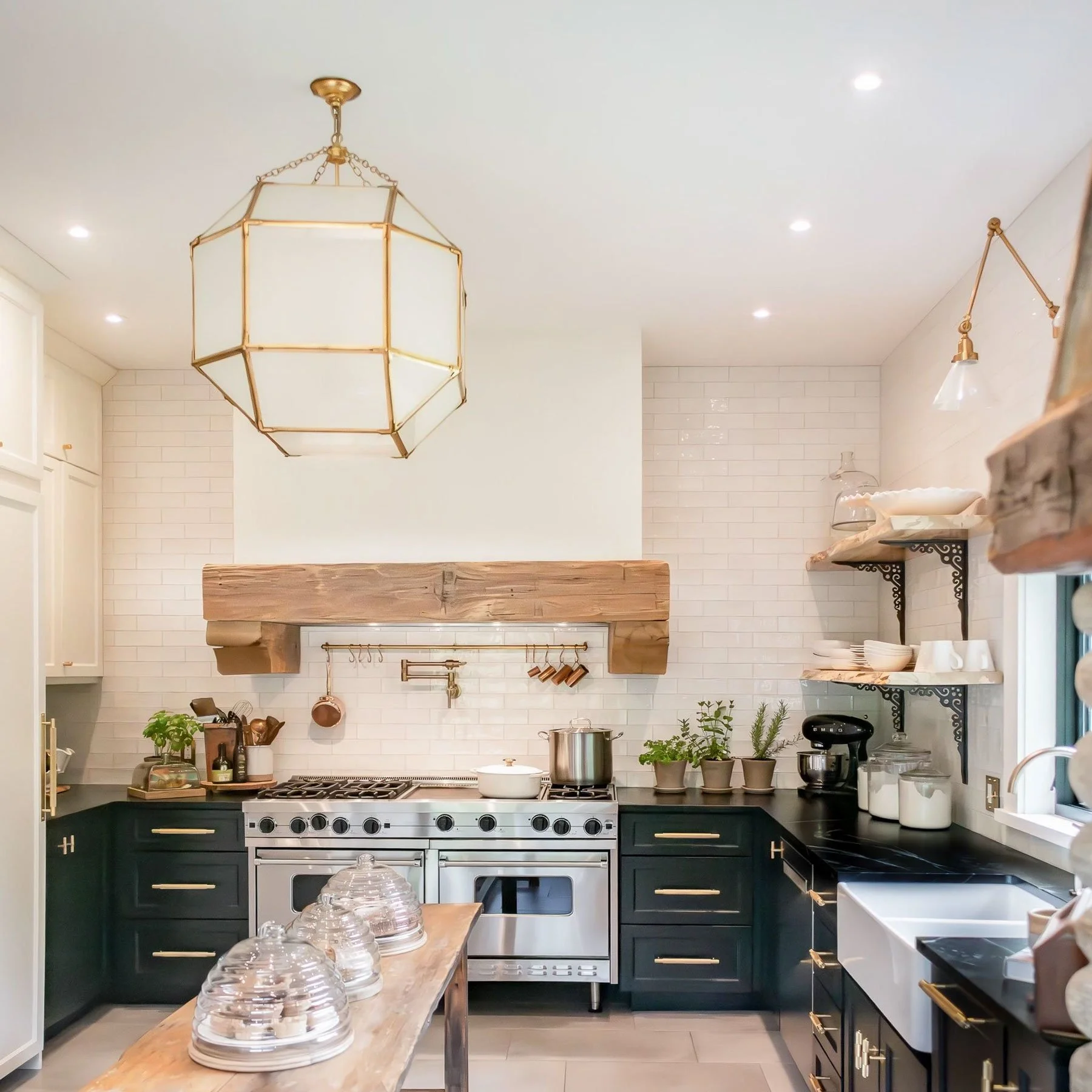 Lighting was another big priority. We wanted layers. We added can lights throughout, swing-arm sconces above the sink (the Waucoba 1-Light), and, at the very center, the showstopper: the Morris Large Lantern from Prima Lighting, in gilded iron with frosted glass. A bit of under-cabinet lighting by the fridge ties it all together. Finally, every exposed wall in the kitchen is clad from counter to ceiling in Stucci ceramic tile from Spain, a soft, off-white finish with an imperfect, natural texture that brings so much warmth and soul to the room.