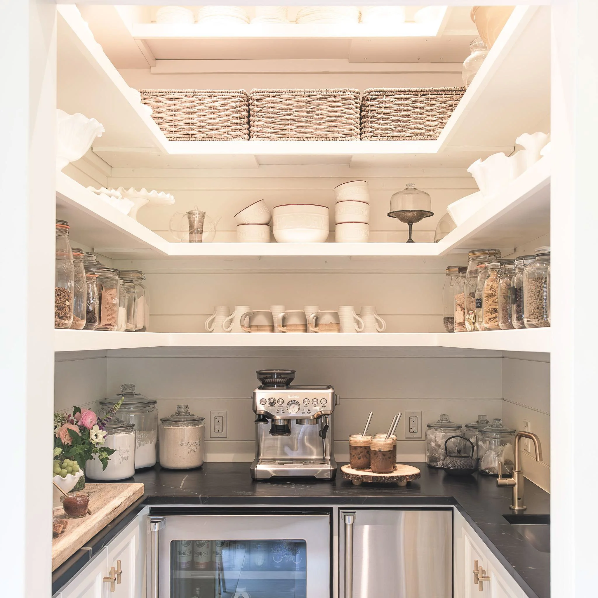 We also made the entrance to the kitchen wider and pushed out the wall to the right of the sliding doors. That extra bit of space came from the living room, which had some square footage to spare, and it allowed us to create a walk-in pantry. We clad the walls with shiplap right up to the ceiling and added an ice maker, beverage center, narrow cupboards, and counter-to-ceiling shelving. It gave us the storage we had always dreamed of.